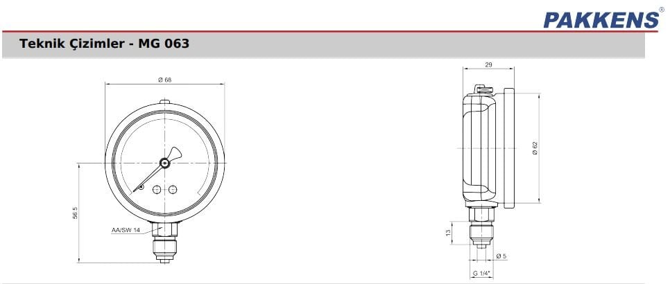 MG063Ø63mm -1 Bar Alttan Bağlantılı Gliserinli (Sıvı Dolgulu) G1/4'' Vakummetre, Vakum Göstergesi CL2,5 PAKKENS